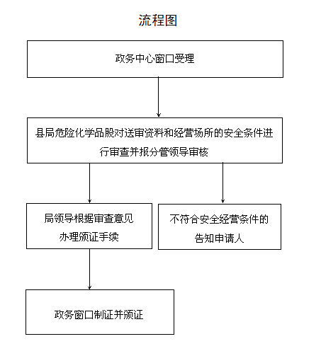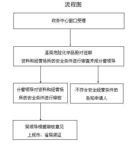 县安监局政务窗口受理、委托危险化学品监管股初审;领导审批;告知或送达申请人。 |